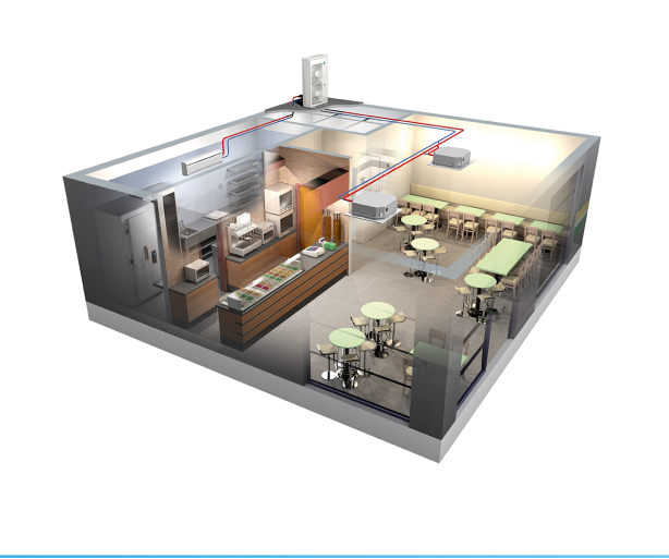 The VRV heat recovery system is designed to provide heating or cooling to different zones simultaneously and eliminates hot and cold spots. With these customized solutions, heat recovered from the back of the restaurant can be used to heat the front of the restaurant.