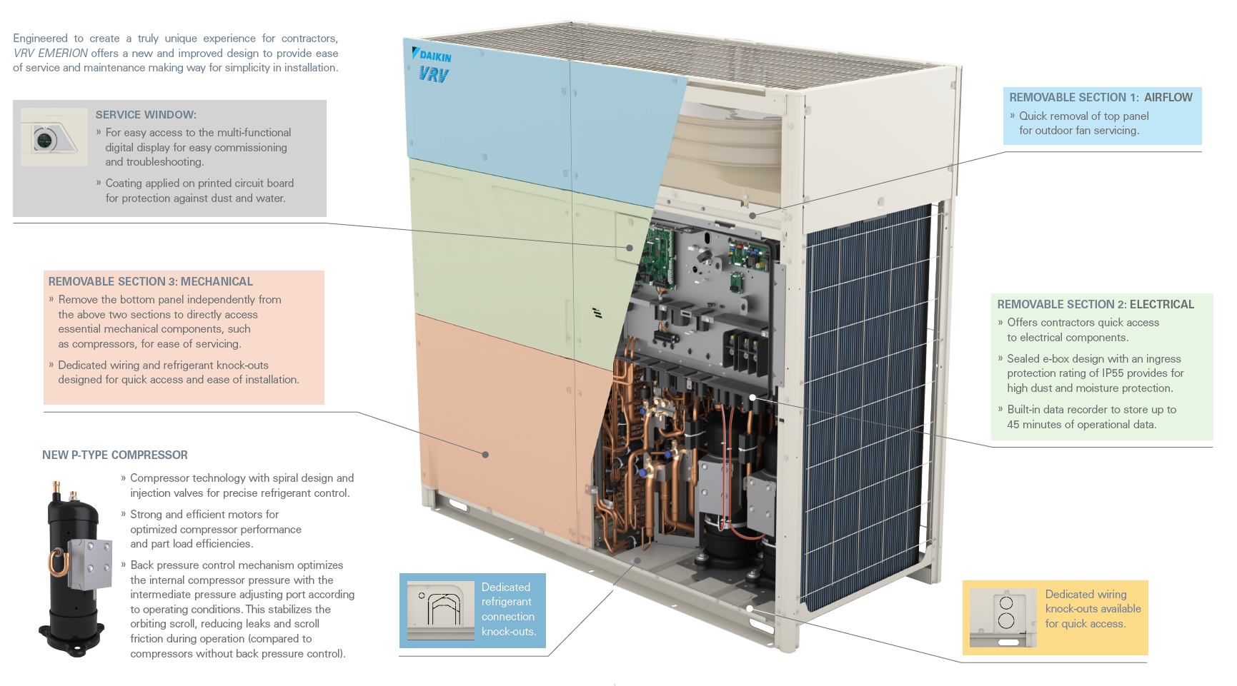 Daikin’s variable refrigerant volume (VRV) system is designed to offer smooth, uninterrupted operation. Predictive maintenance utilizing IoT and smart sensors can help alert building managers to potential issues before they lead to breakdowns. Because each zone or room can be individually air-conditioned, necessary maintenance may be resolved room-by-room or unit-by-unit without disrupting the operation of the entire building.