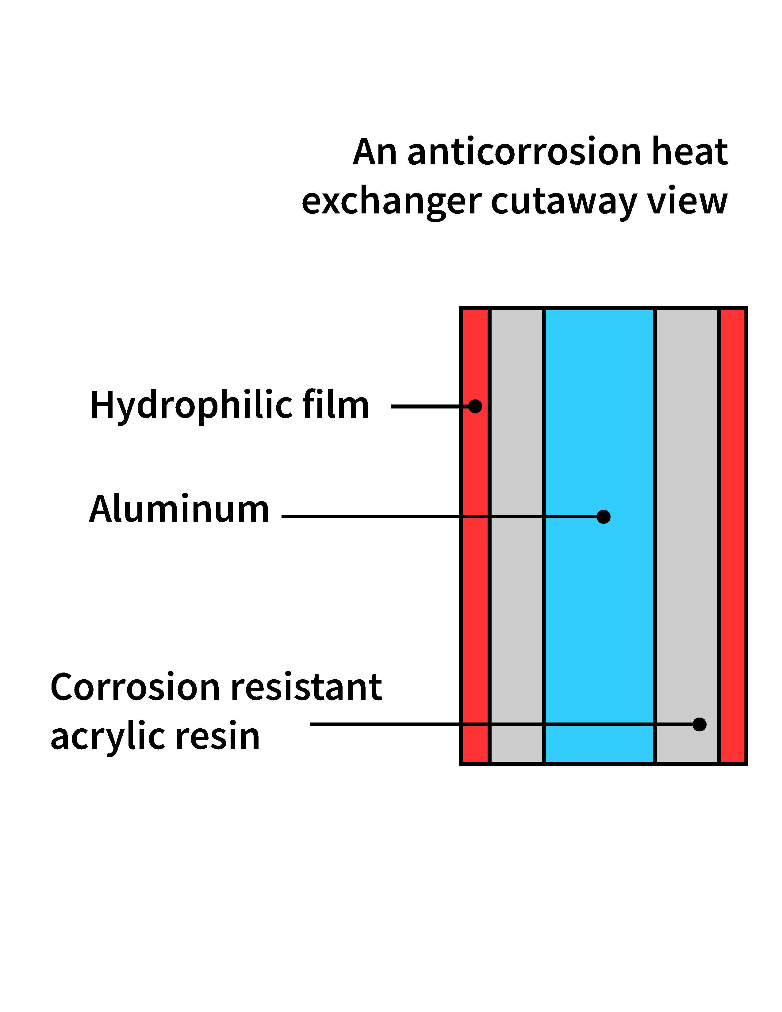 Our PE fin coil coating protects the outdoor unit coil from corrosion and reduces friction to allow water to drain quickly from the coil during defrost.